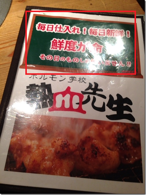 どうやら、熱血先生ではこれから「鮮度が命」を売りに商売していくようで、鮮度がない漬けた肉の壺漬けホルモンはメニューから消えてしまったようです(-.-;)